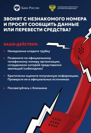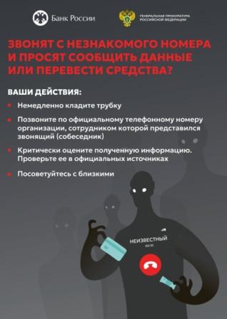 Генеральной прокуратурой Российской Федерации совместно с Банком России разработаны цифровые плакаты в целях повышения уровня информированности населения о действиях лиц, вводящих в заблуждение в целях хищения денежных средств, ввиду возрастания угроз преступных посягательств в сфере телекоммуникаций